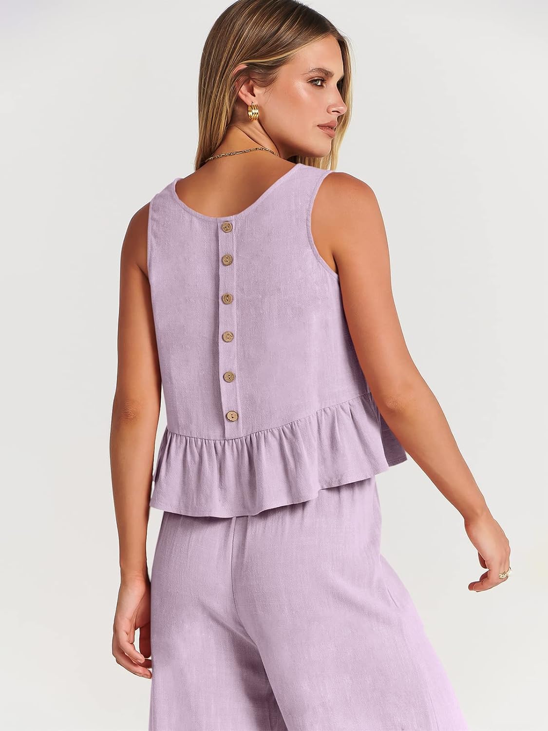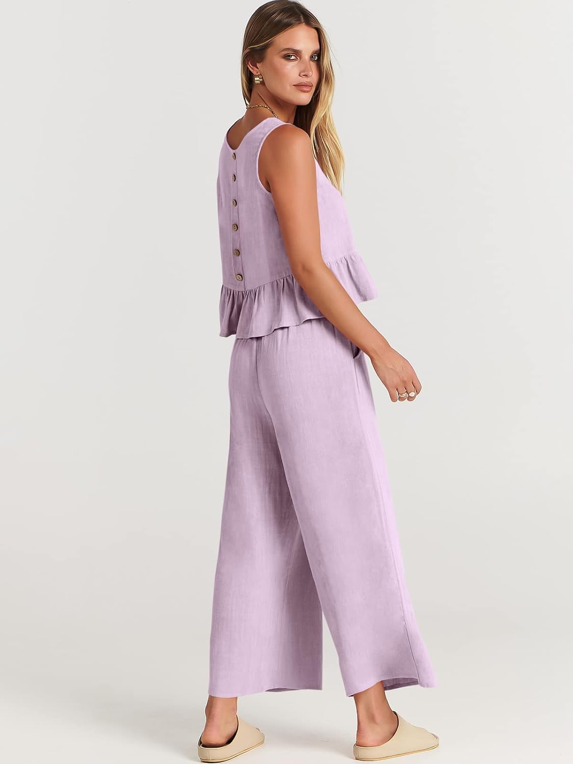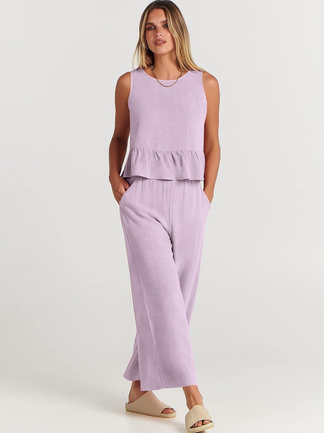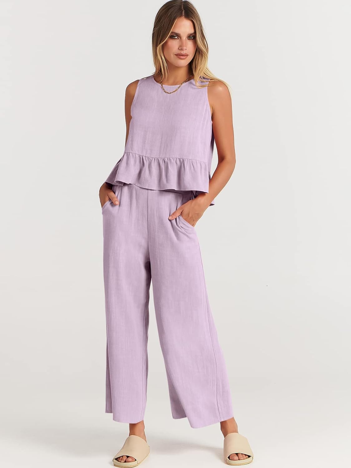 100% Viscose Linen Two Piece Coord set - Ruffles Crop Top & Wide Leg Pants - Lilac