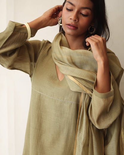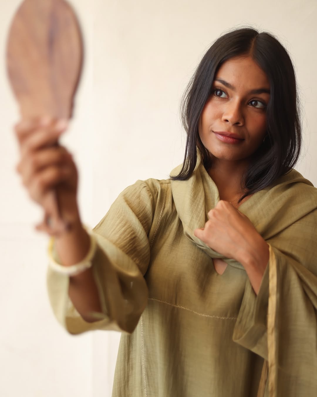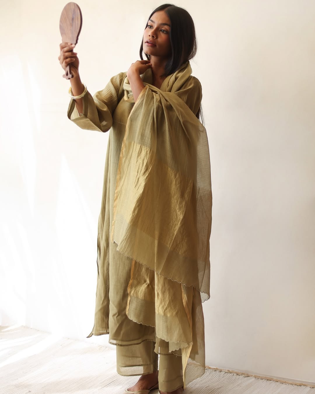 Back-to-basics with the wardrobe essential evergreen kurta in soft handwoven chanderi silk. The uniqueness of this kurta lies in its versatility to be paired several ways. The kurta is paired here with a matching farshi and chanderi dupatta to complete the look.